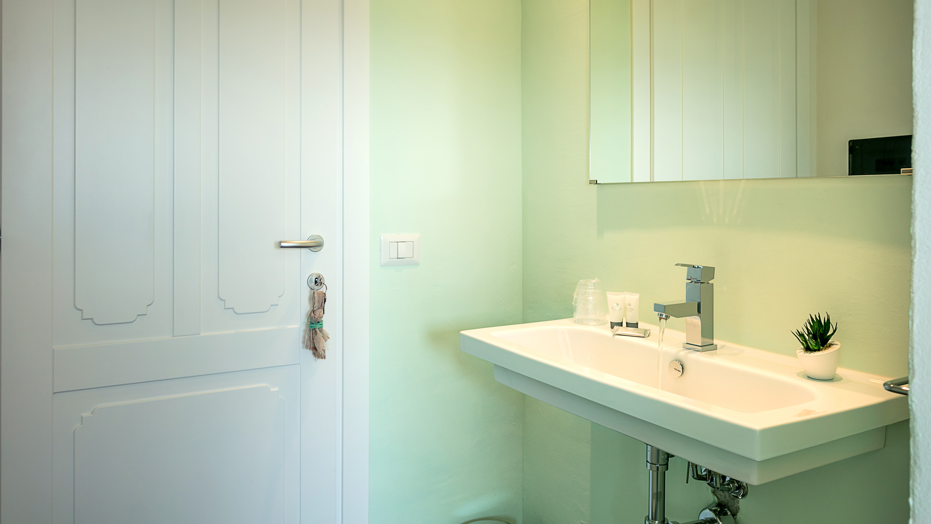 The bedroom is a true sanctuary, featuring a breath-taking window that perfectly frames the sea and the majestic Tavolara Island. Decorated with refined touches, it offers a plush queen-size bed dressed in exquisite green Sardinian fabrics, adding a touch of local charm to your stay.